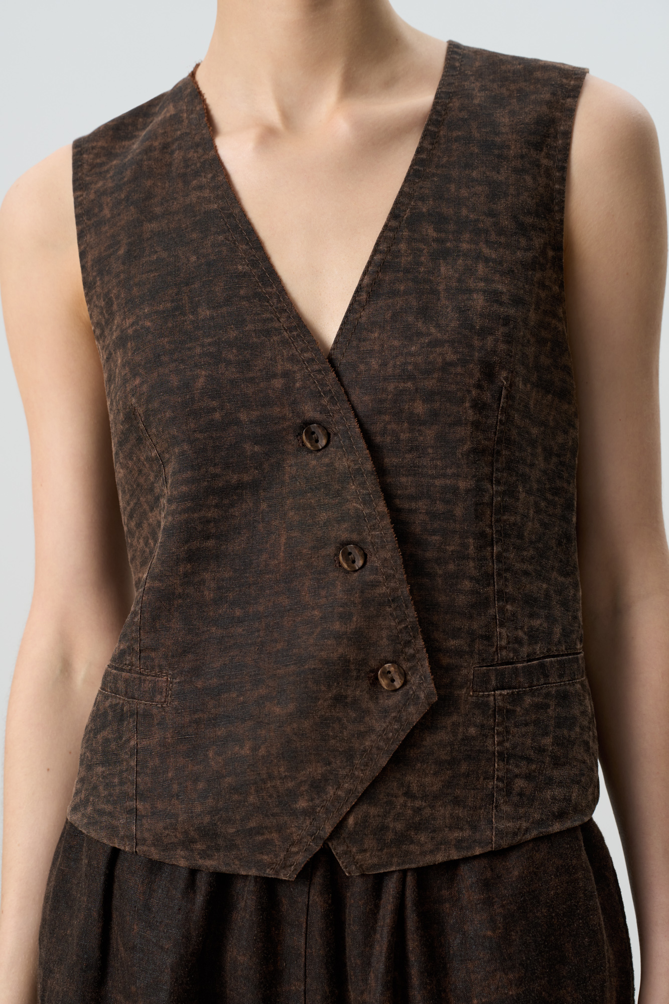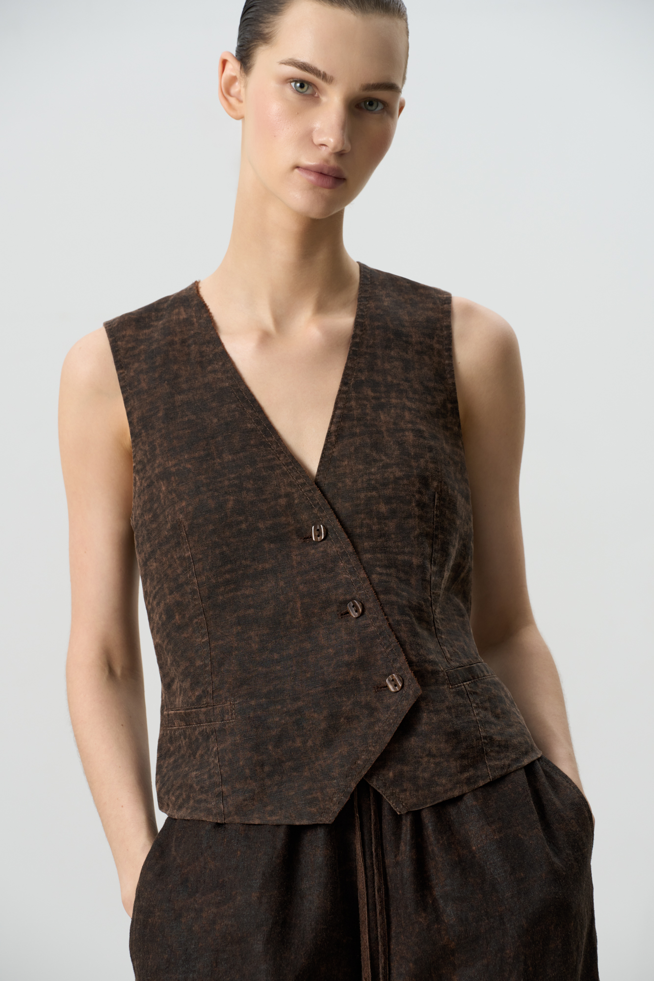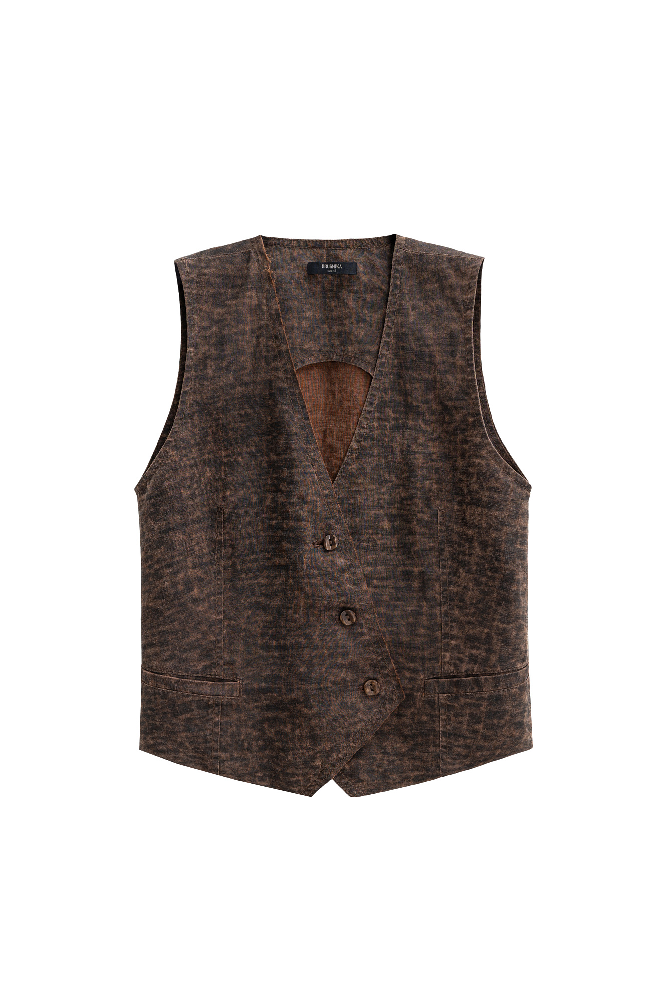 Жилет изо льна с добавлением волокна крапивы. Модель прямого кроя, с двумя карманами и косой застежкой на три пуговицы.