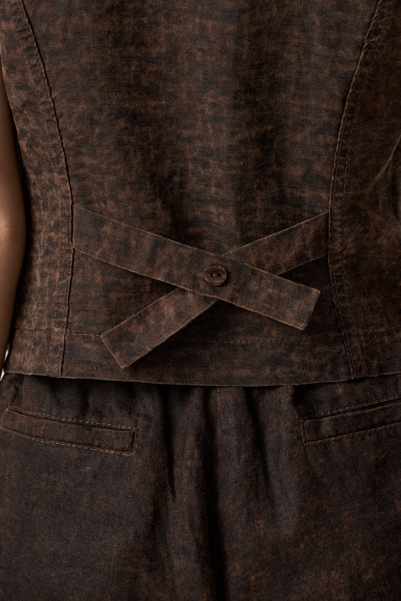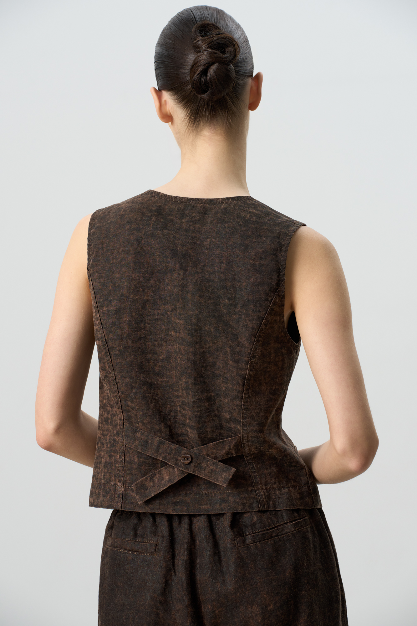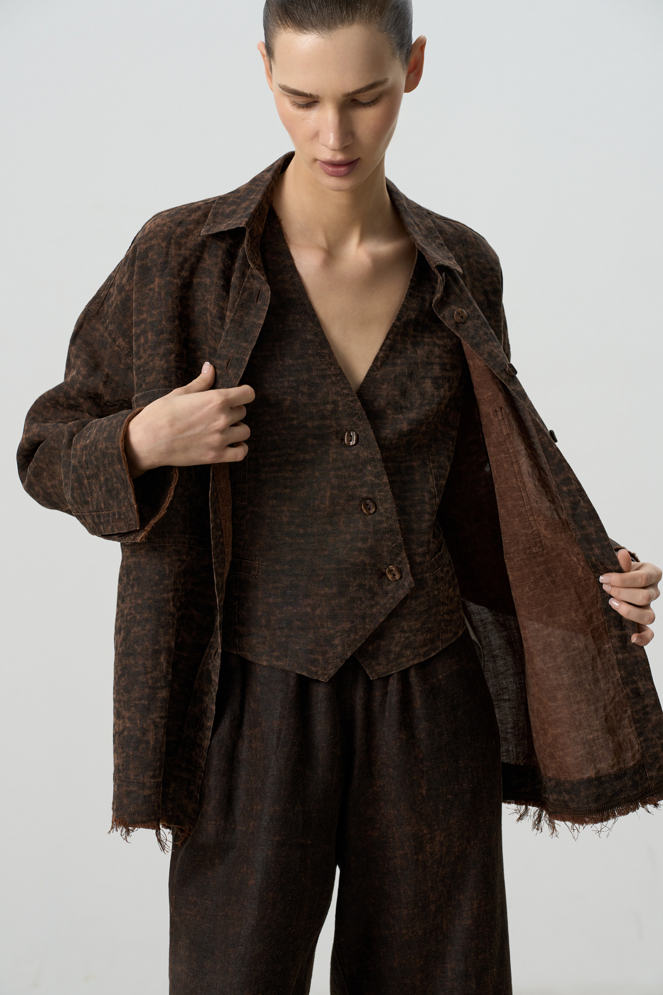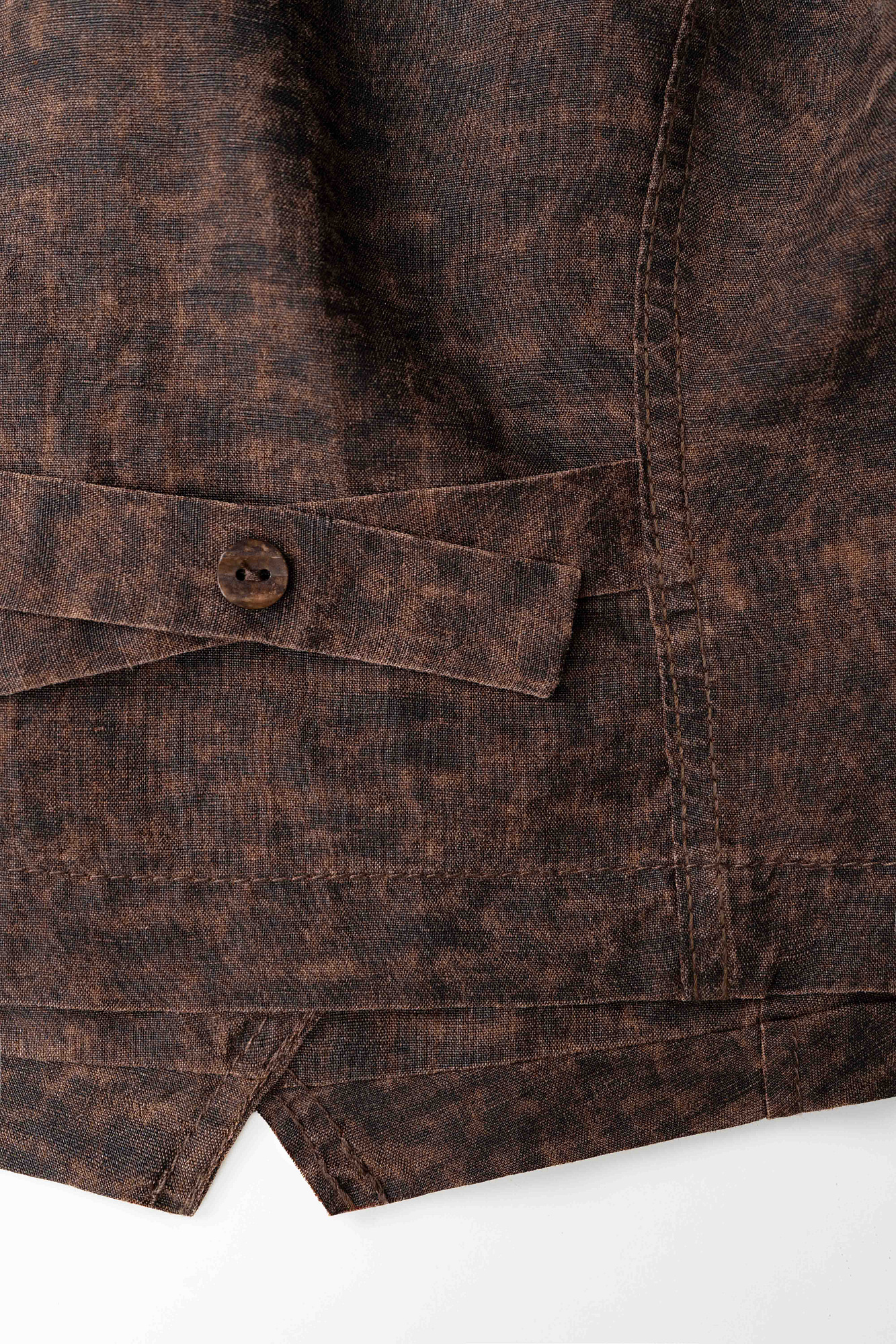 Жилет изо льна с добавлением волокна крапивы. Модель прямого кроя, с двумя карманами и косой застежкой на три пуговицы.