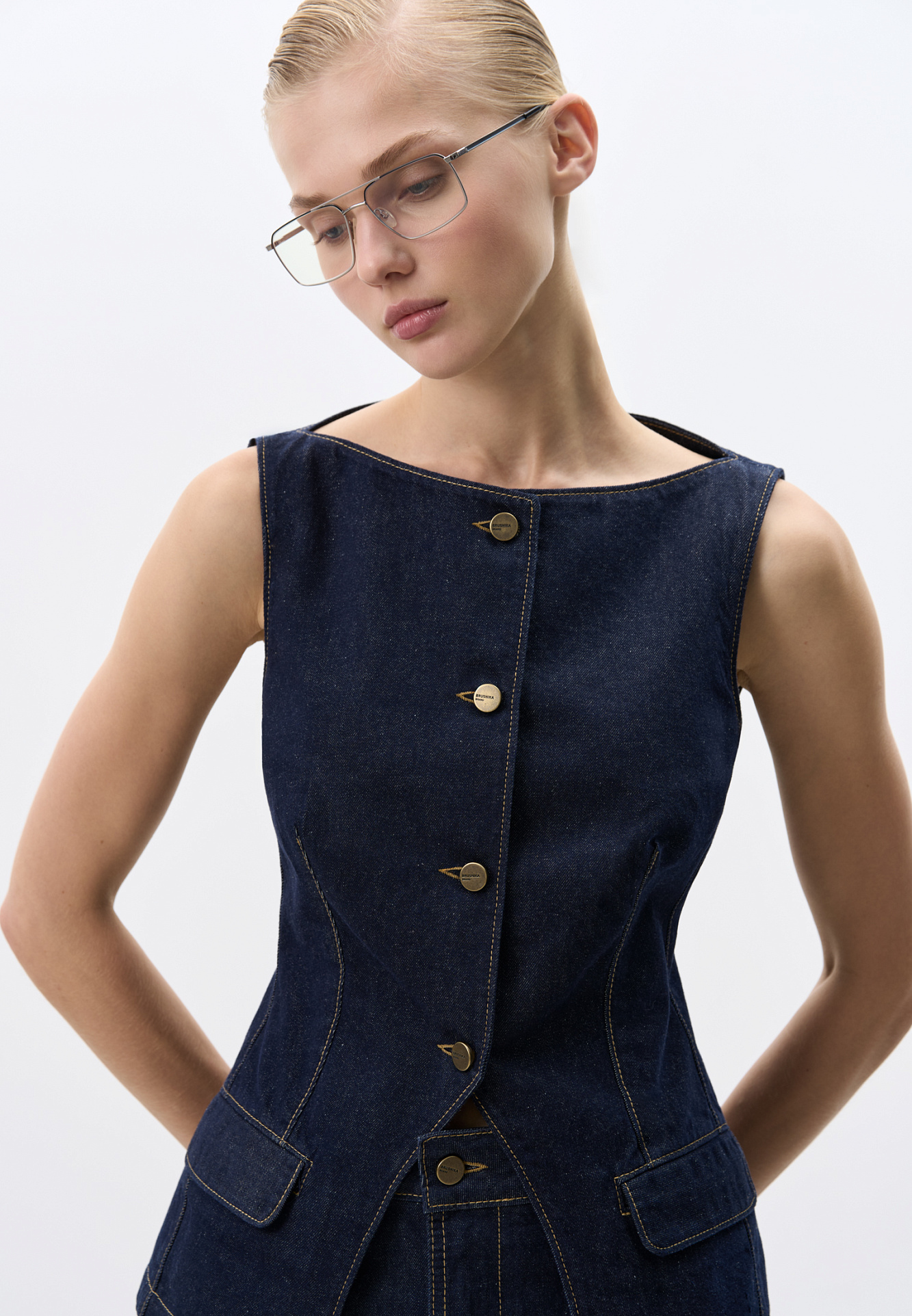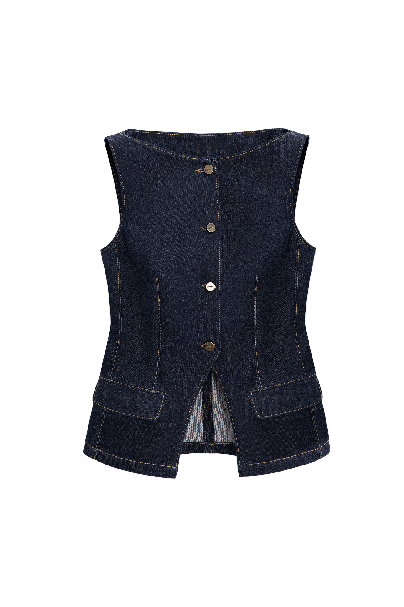 Джинсовый жилет из 100% хлопка. Модель приталенного силуэта с акцентыными вертикальными вытачками, вырезом горловины лодочка и имитацией карманов с клапанами. Застежка на металлические пуговицы.