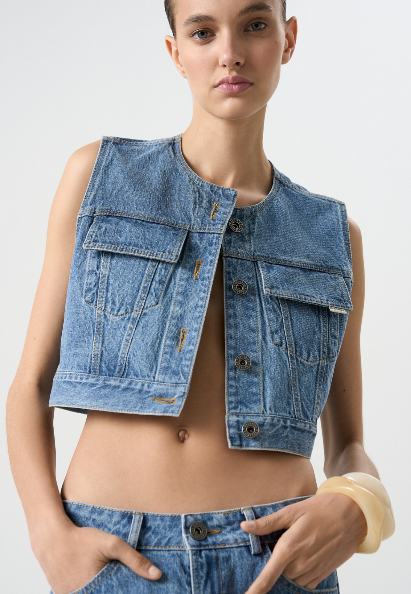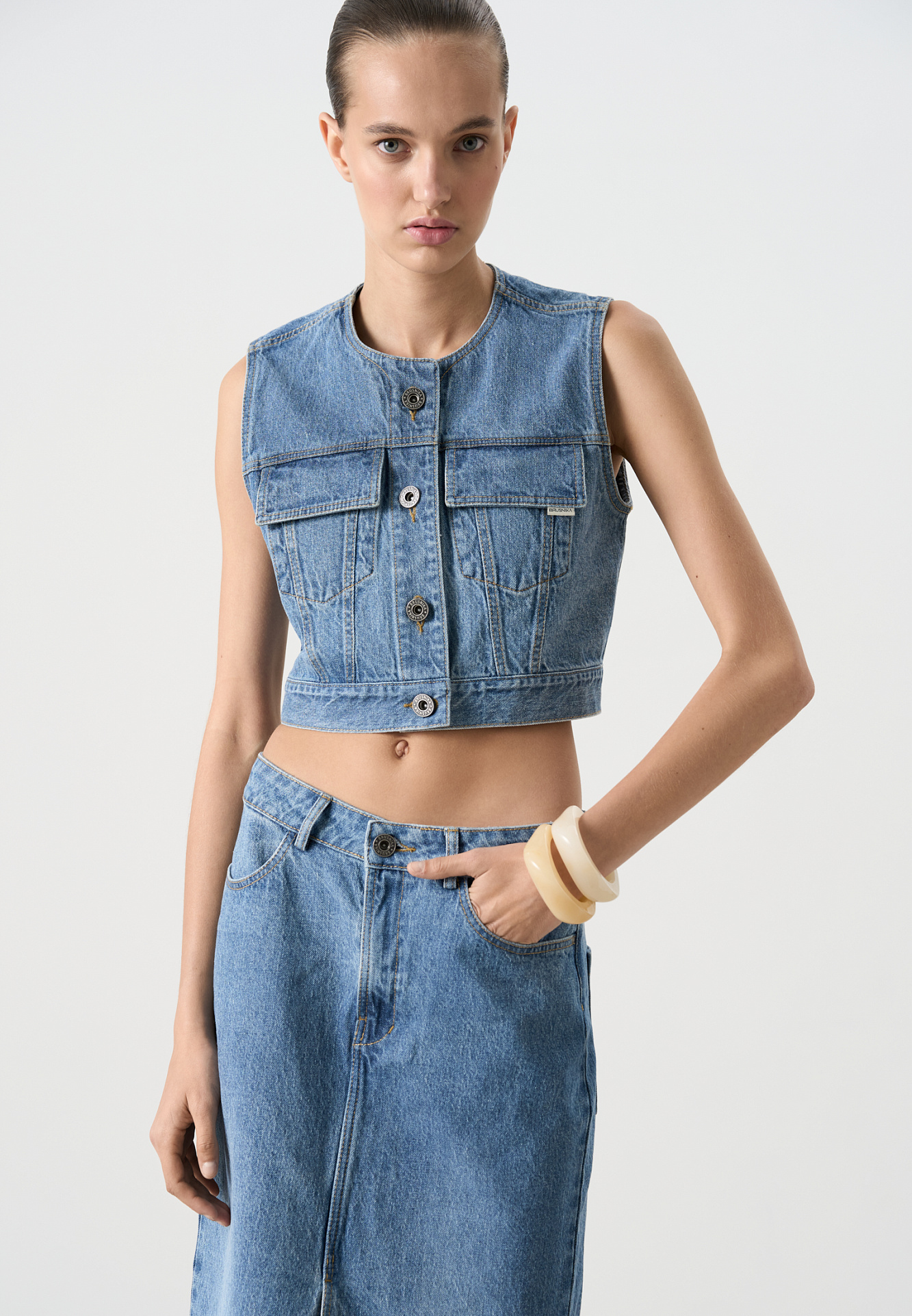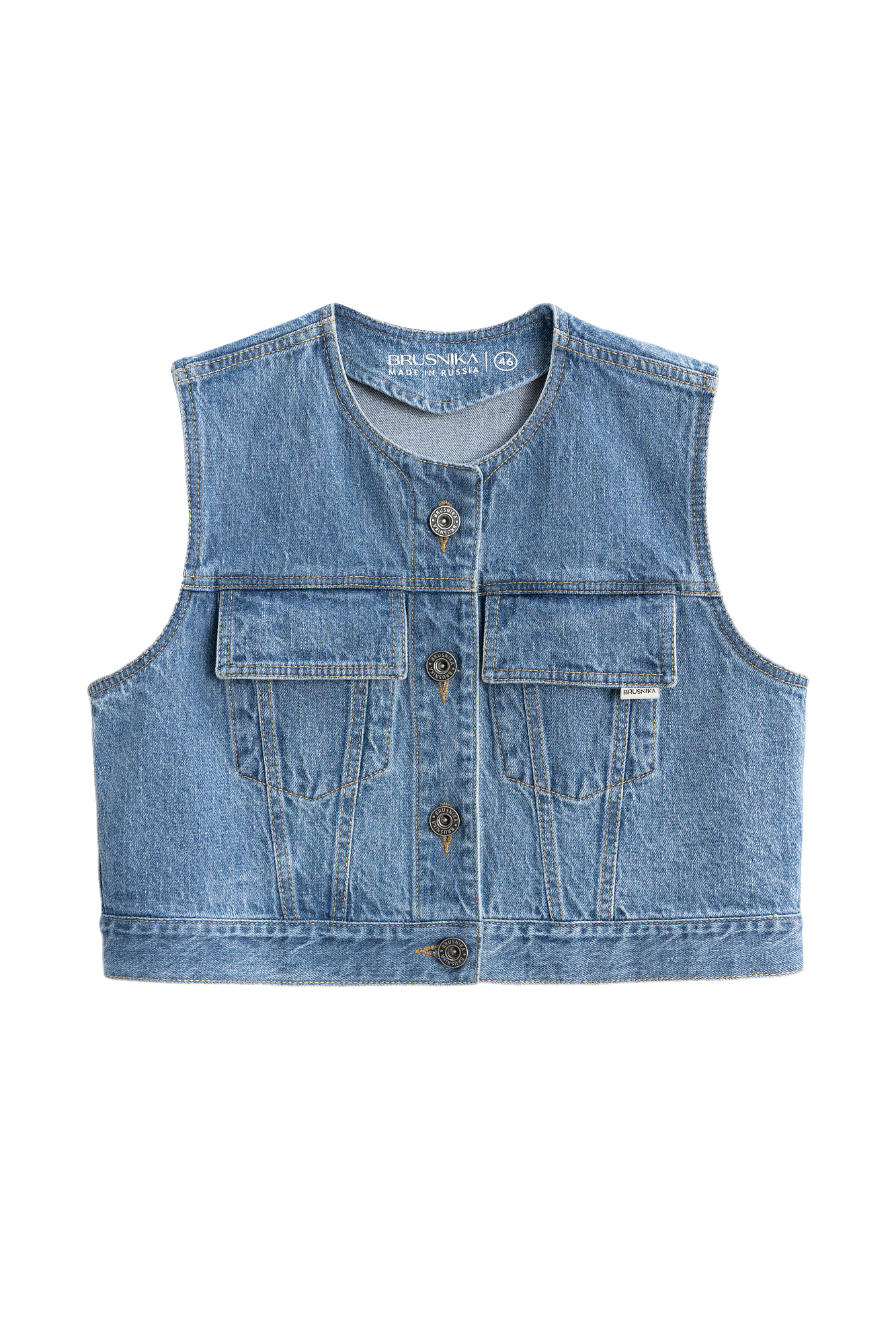 Короткий джинсовый жилет из 100% хлопка. Модель прямого кроя, с неглубоким круглым вырезом горловины, нагрудными карманами с клапанами и застежкой на большие металлические пуговицы.