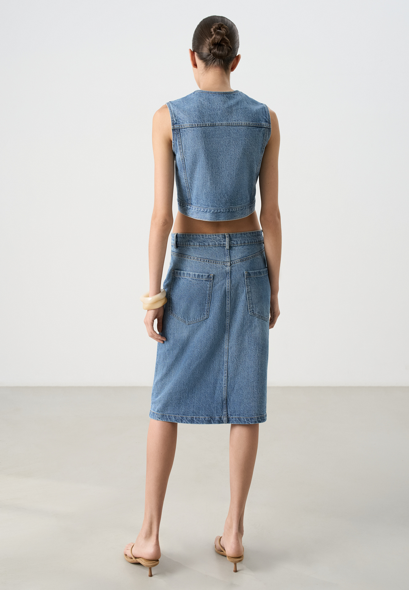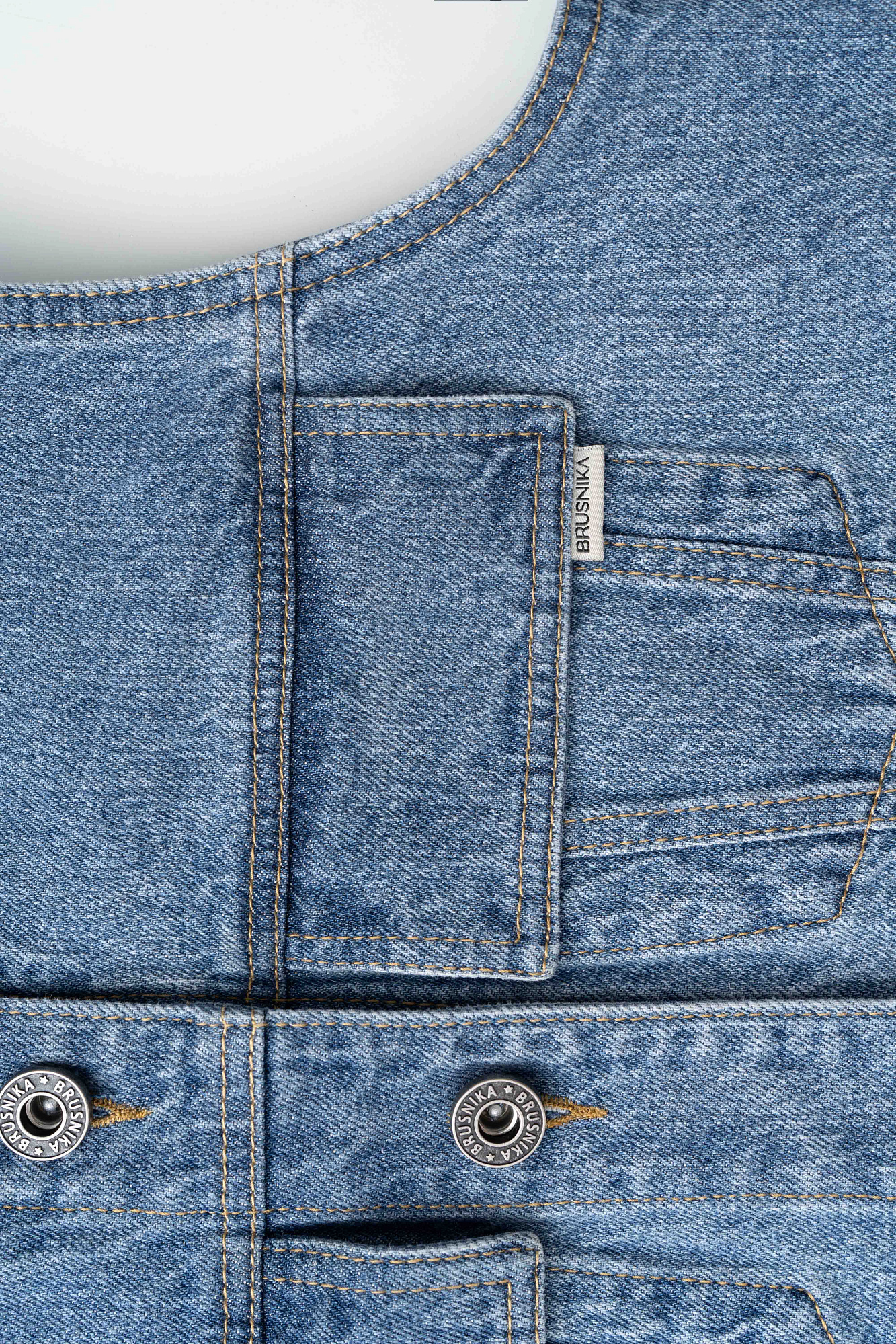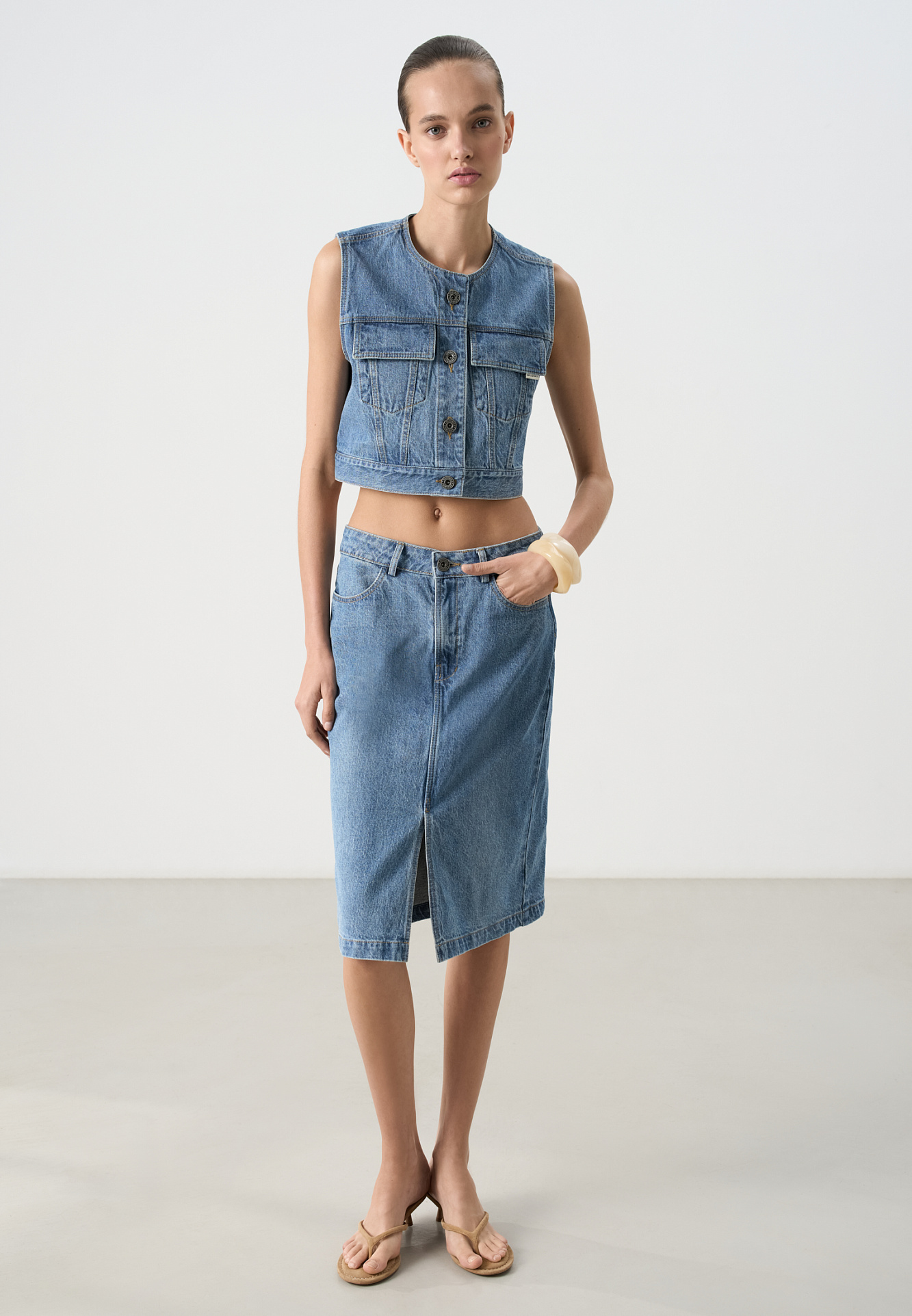 Короткий джинсовый жилет из 100% хлопка. Модель прямого кроя, с неглубоким круглым вырезом горловины, нагрудными карманами с клапанами и застежкой на большие металлические пуговицы.
