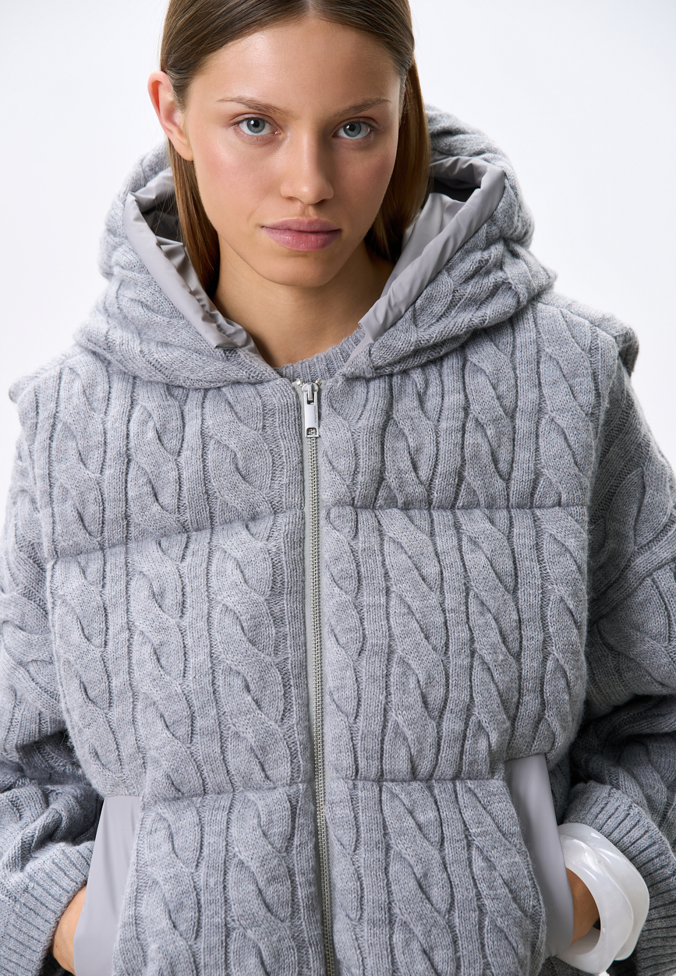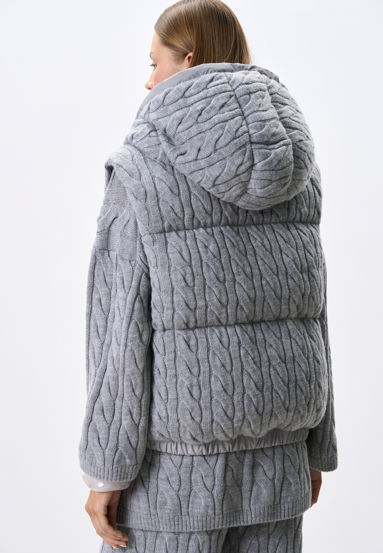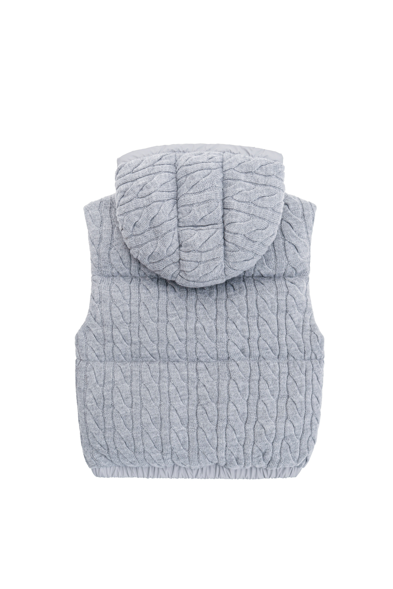 Стеганый жилет на пуху с трикотажным верхом, выполненным объемными косами из мягкой шерсти. Модель прямого кроя, с капюшоном и двумя карманами. Низ изделия выполнен на резинке. На подкладке.