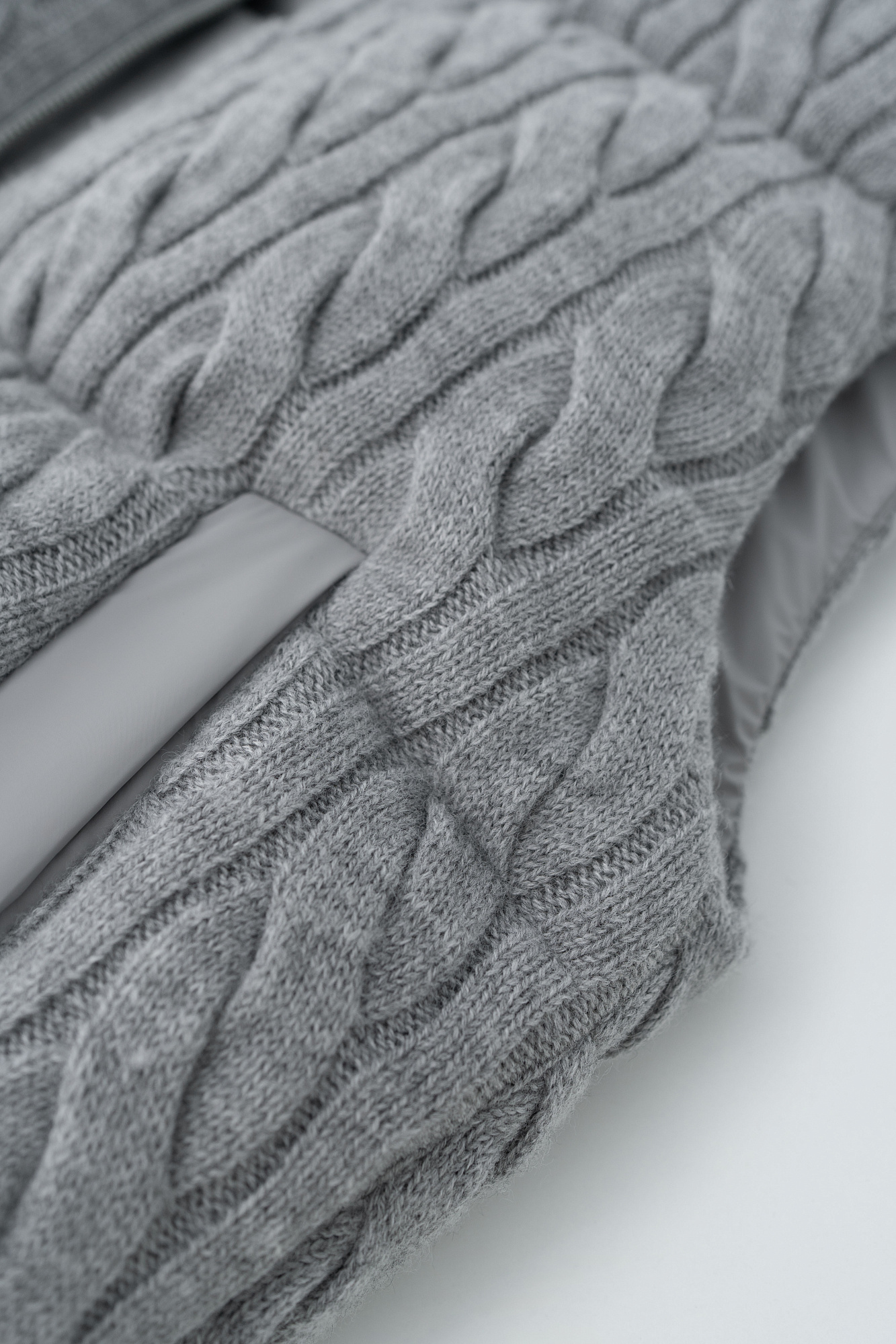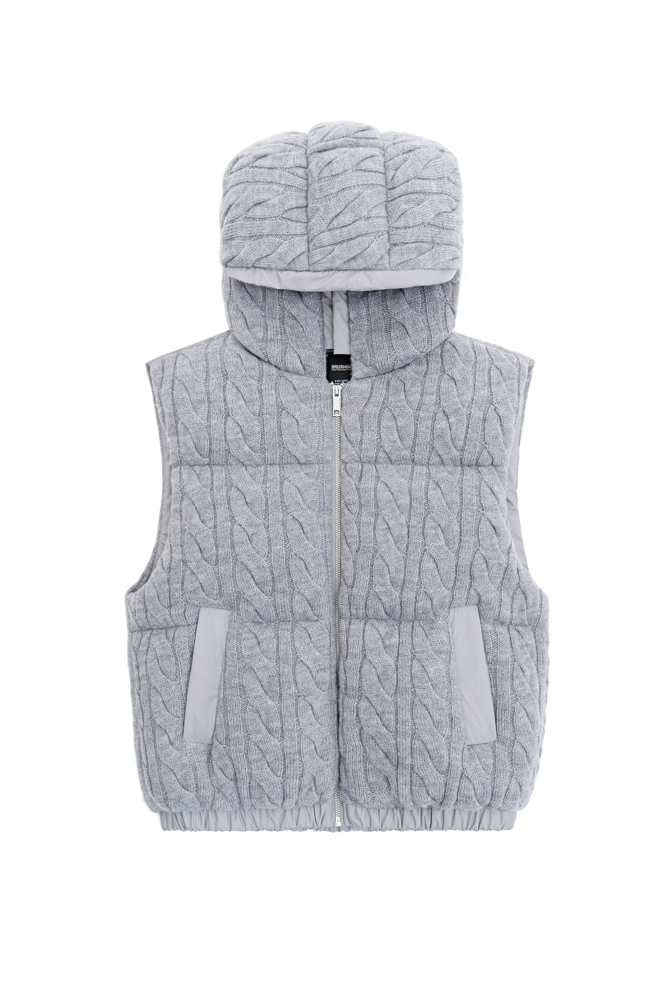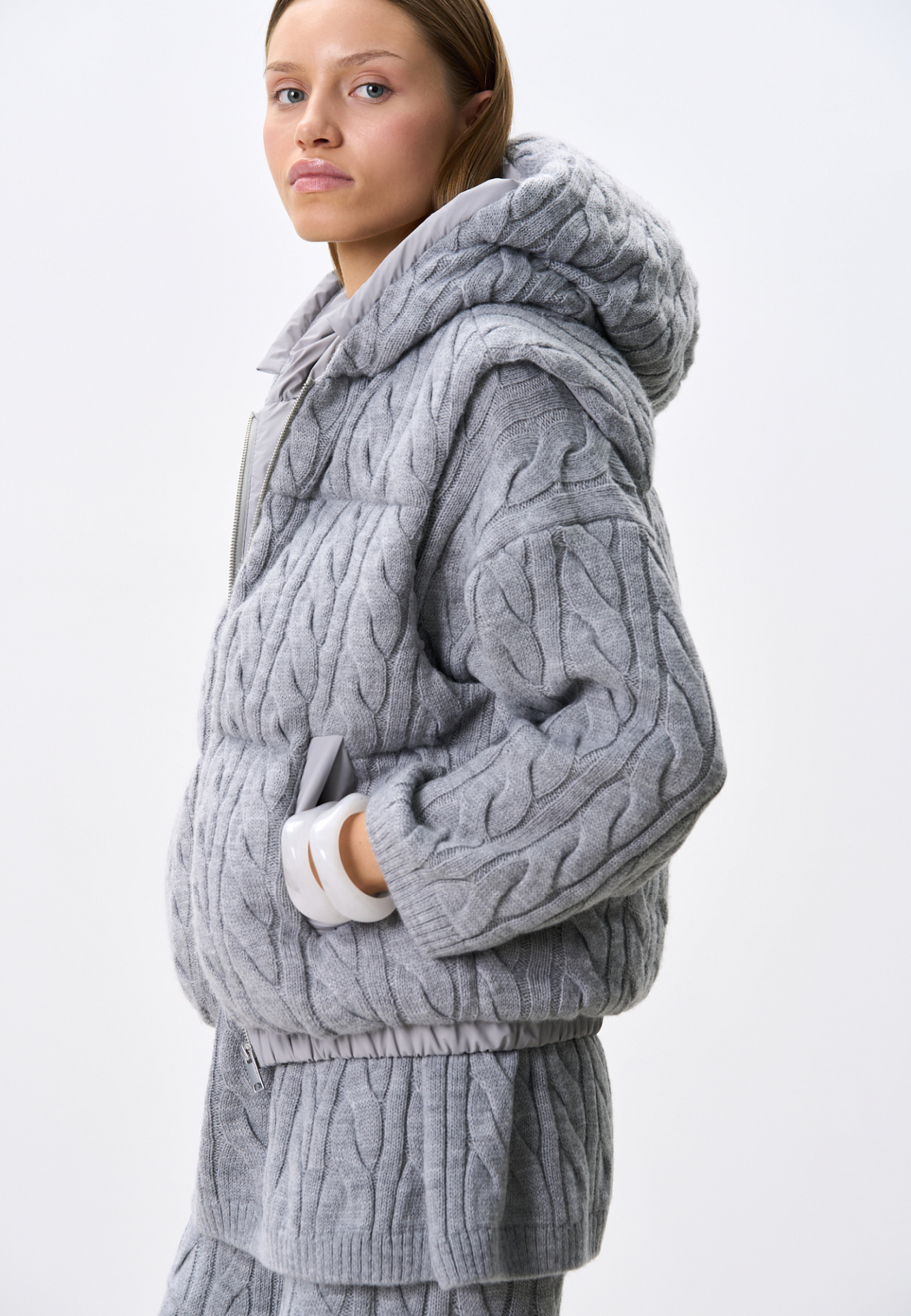 Стеганый жилет на пуху с трикотажным верхом, выполненным объемными косами из мягкой шерсти. Модель прямого кроя, с капюшоном и двумя карманами. Низ изделия выполнен на резинке. На подкладке.