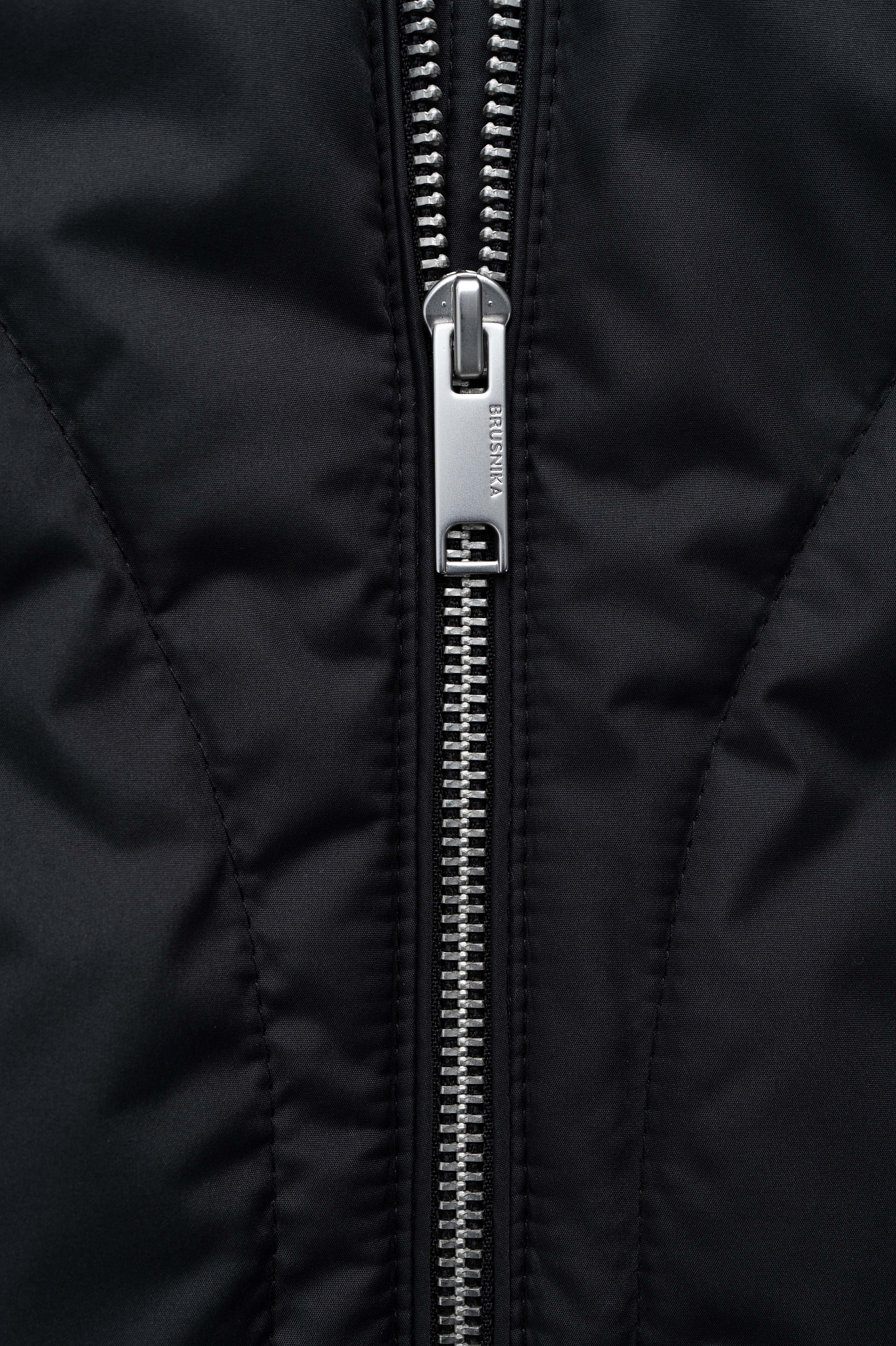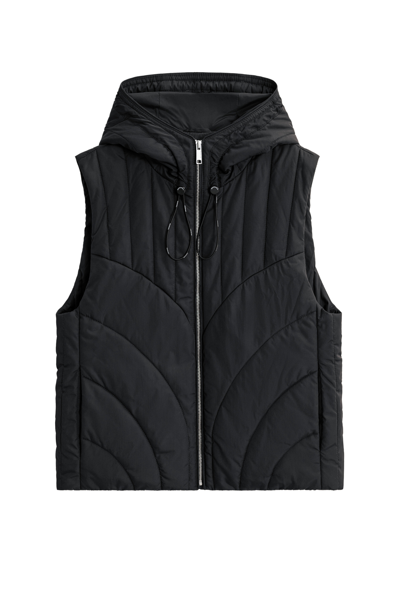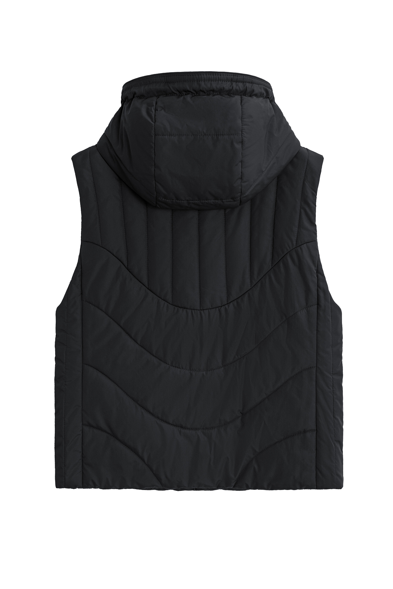 Жилет на синтепоне с капюшоном. Модель свободного силуэта с боковыми карманами. Капюшон регулируется кулиской. Застежка на молнию. На подкладке.