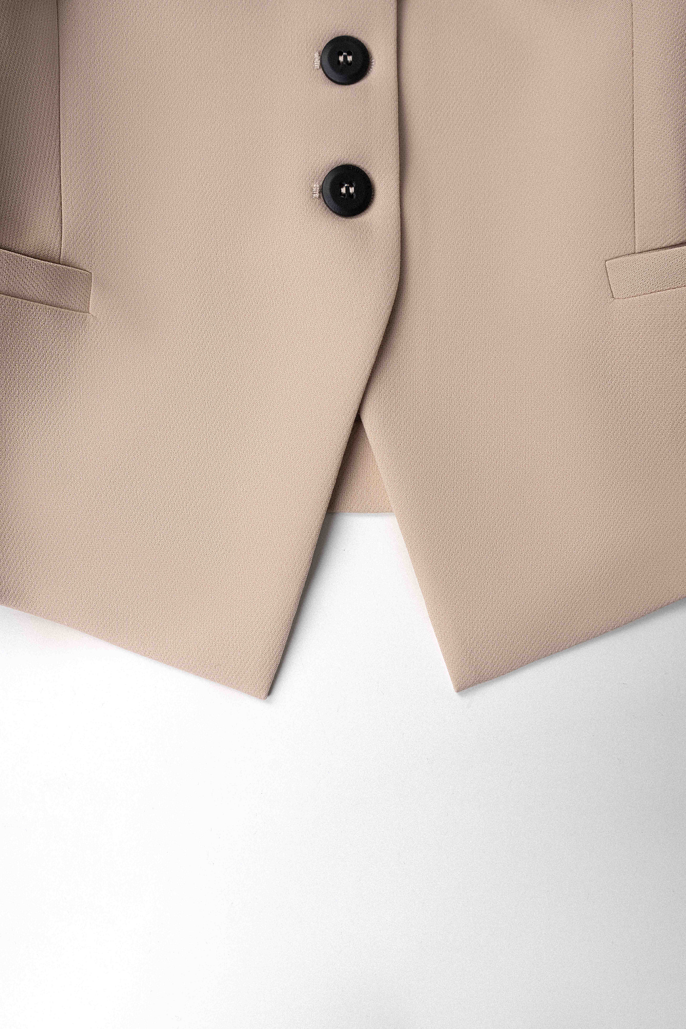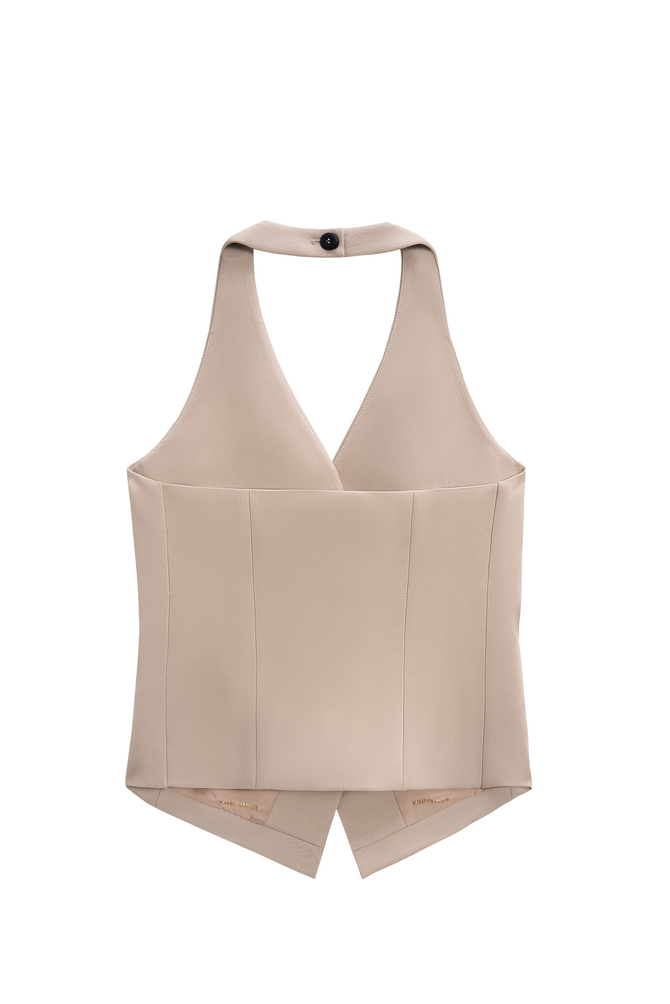 Жилет из поливискозы с открытой спиной и вырезом халтер. Модель приталенного силуэта с глубокой проймой, V-образным вырезом горловины и прорезными карманами. Застежка на пуговицы.