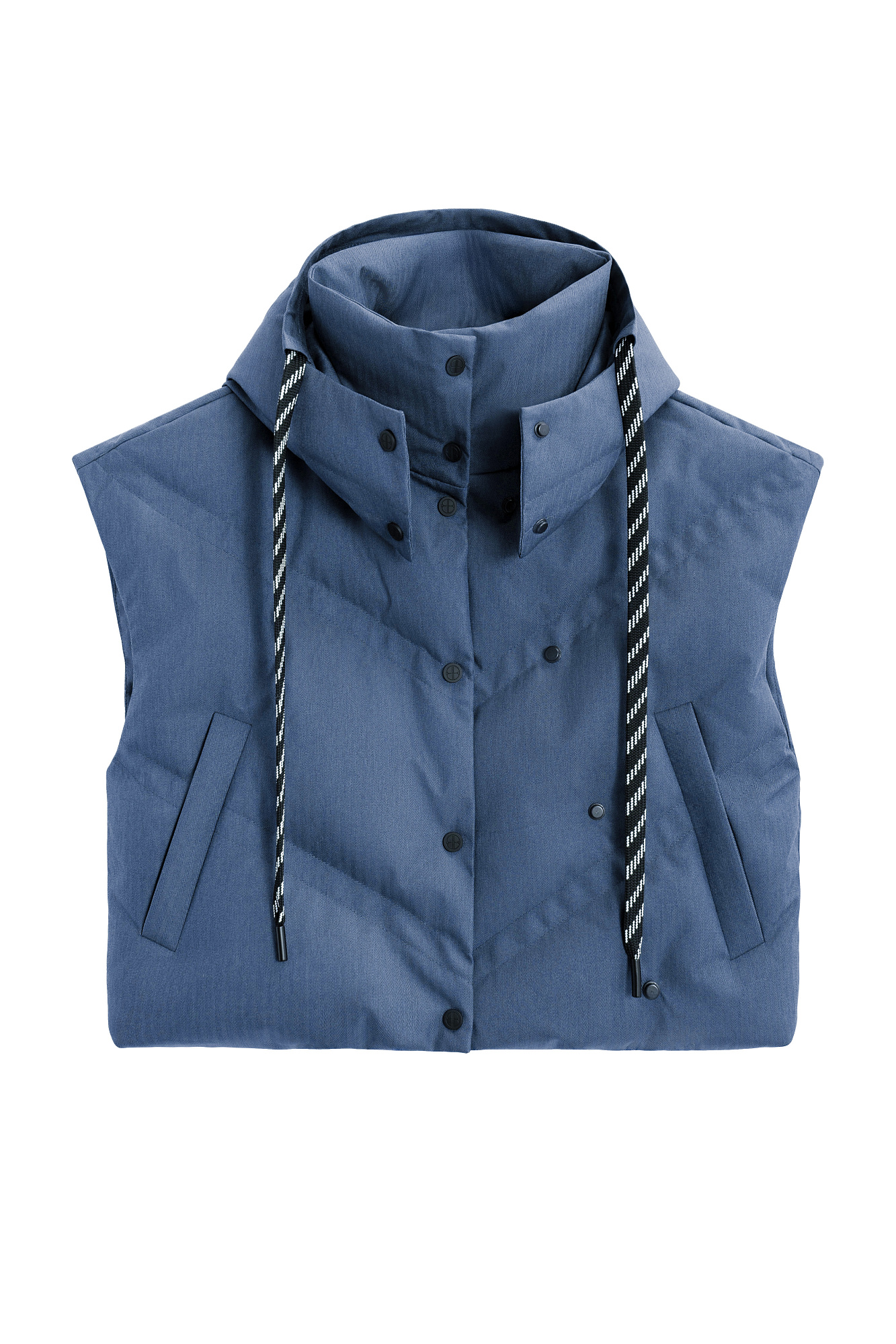 Стеганый жилет на пуху с двойной отстрочкой. Модель с капюшоном и воротником-стойкой. Застежка на кнопки. Низ изделия выполнен на регулируемой кулиске.