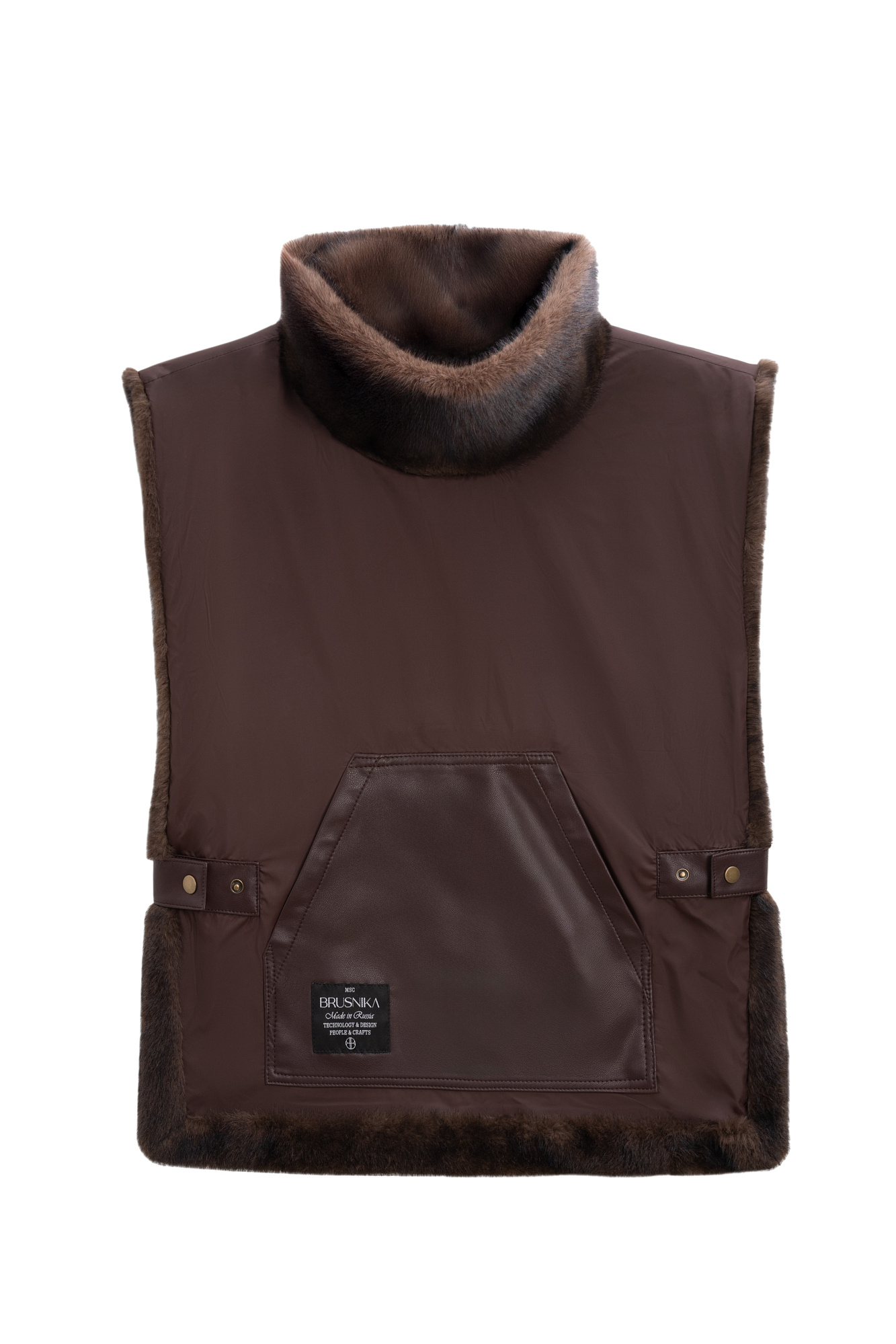 Жилет из экомеха с воротником-стойкой и карманом-кенгуру. Модель фиксируется по бокам на кнопки. Изделие выполнено на подкладке.